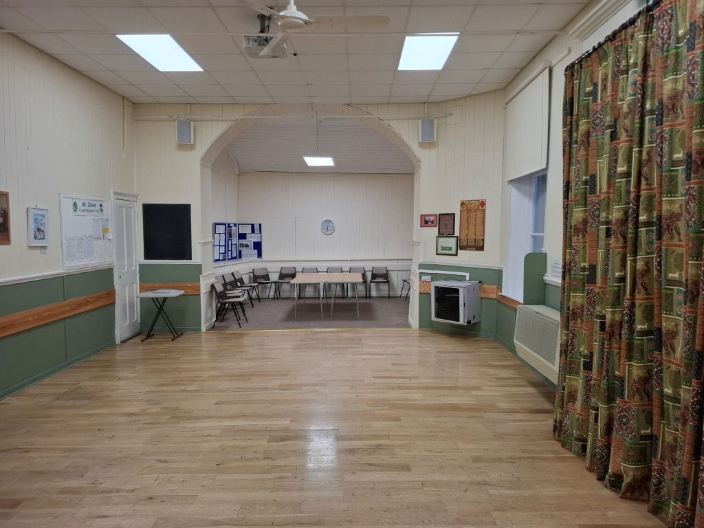 A newly refurbished modern light hall, 15m x 5.5m, with wooden floor and equipped for a variety of uses, including film shows, dance, drama, parties, luncheons and indoor recreations.